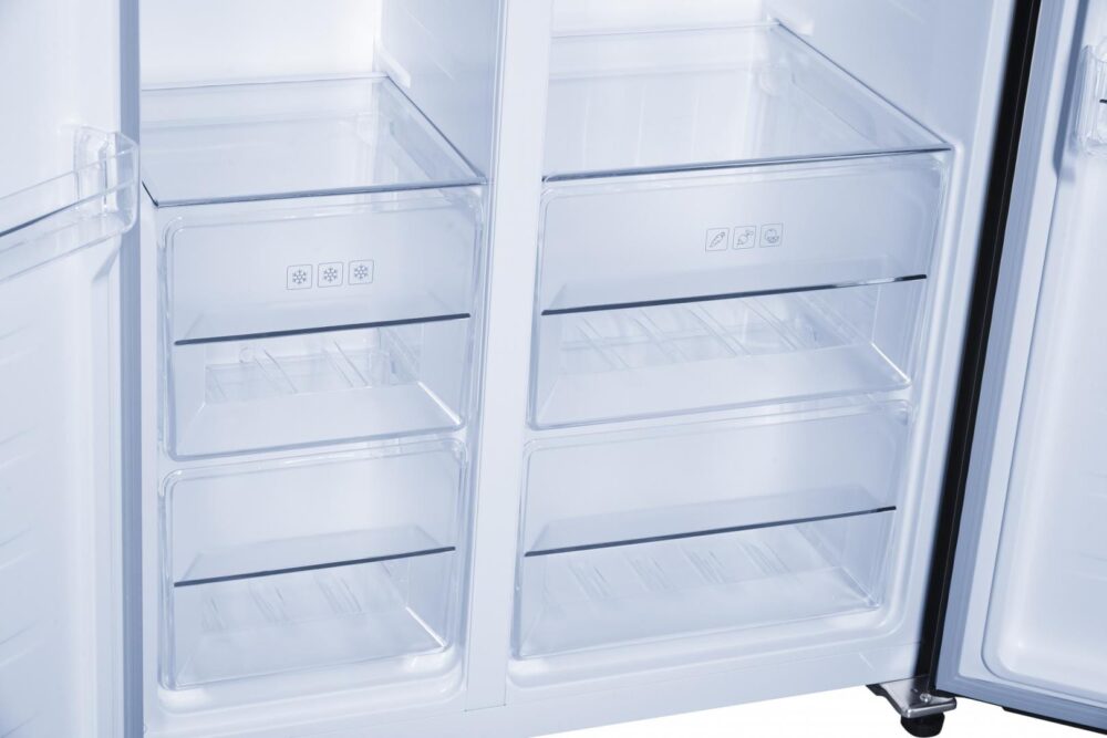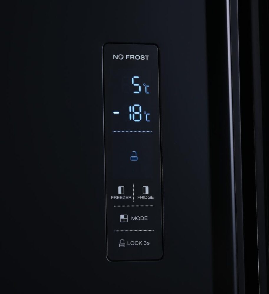 Side by side Heinner HSBS-H442NFBKE+, Full No frost, Compresor inverter, Clasa energetica E, Display LED cu control touch, Capacitate totala: 442L, Capacitate frigider: 291L, Capacitate congelator: 151L, Lumina LED, Functie SMART, Functie ECO, Super Cooling, Super freezing, Alarma usa deschisa, Blocare acces copii, 3 rafturi din sticla frigider, 2 compartimente pentru fructe si legume, 3 rafturi congelator, 2 sertare congelator, Dimensiuni (WxDxH): 90.5 x 59.5 x 177 cm, Culoare: Negru