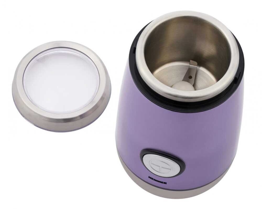 Rasnita electrica HEINNER HCG-150MOV, catacitate 50g, putere 150w, interior din inox, lamne din inox, sistem de siguranta, buton ON/OFF, mov sidefat